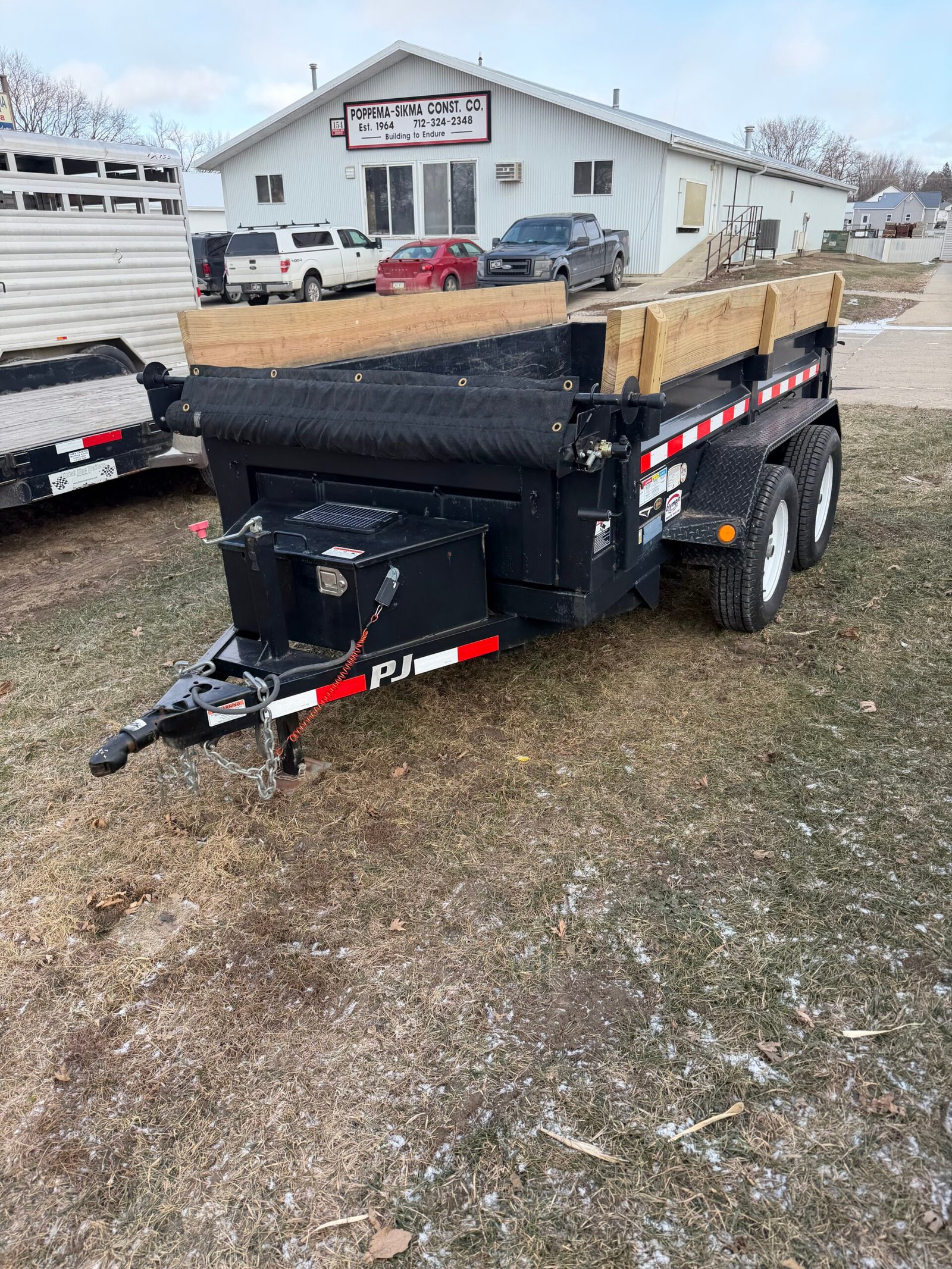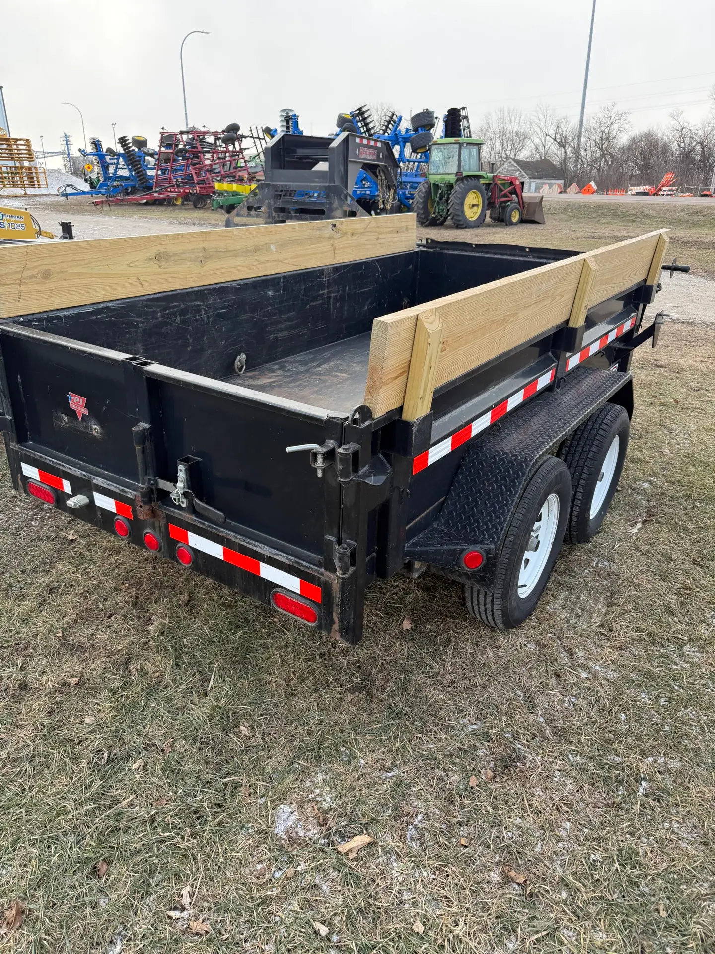USED PJ DUMP TRAILER, POWER UP/ GRAVITY DOWN, TANDEM 3,500LB AXLES, SOLAR CHARGER, 110V BATTERY MAINTAINER, TARP, WOOD SIDE EXTENTIONS!
